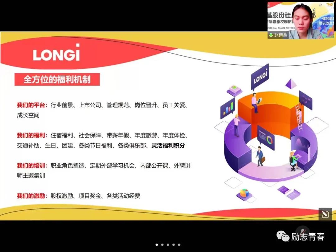 会上,隆基股份校招负责人赵博鑫以PPT的形式就其公司简介、福利待遇、招聘流程、重点招聘岗位及鄂尔多斯建厂的主要项目、投资、产量等几个方面向同学们进行了详细地讲解。