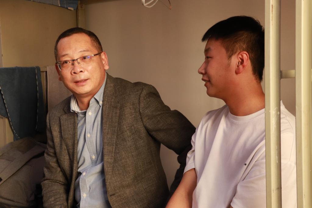 此外,张玉柱还走访了2024级采矿工程校企合作订单班的宿舍,与同学们畅谈入学感受,询问生活情况。“同学们,家是哪里的?”“军训累不累?”“宿舍住得习不习惯?”“食堂饭菜是否合胃口?”一句句殷切关怀,一声声暖心问候,让同学们倍感亲切和温暖。他向同学们介绍了毕业后即将进入企业的基本情况,鼓励同学们在校企合作的平台上珍惜机会、勤奋学习、乐于实践,为进入企业工作奠定坚实的基础。最后,张玉柱分享了自己的学习经验和人生感悟,勉励同学们树立正确的人生观、世界观和价值观,积极参与各类活动,提升个人综合素养。