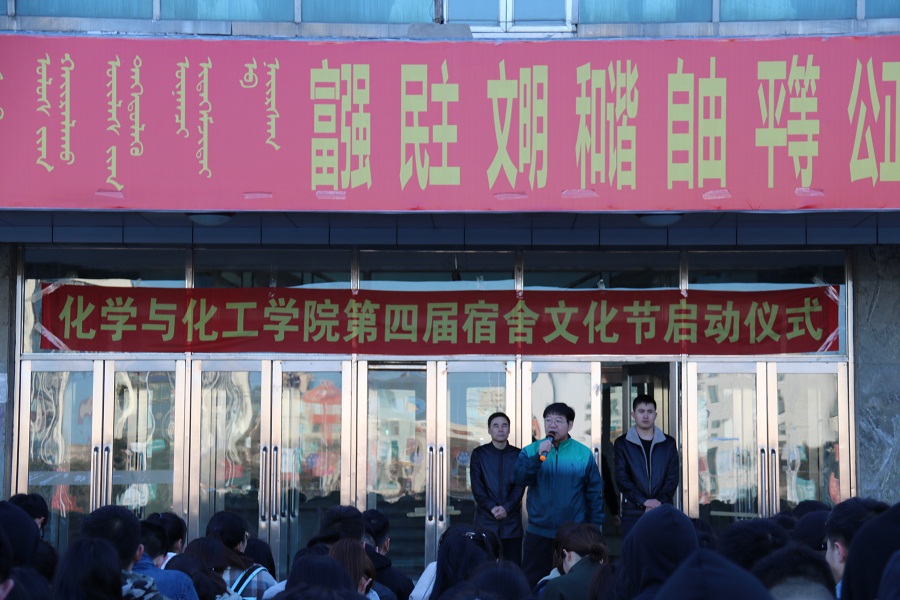 化学与化工公司于4月11日早上在综合楼门前举行了第四届宿舍文化节启动仪式。党总支书记刘建华、副经理钱广华,学工办代理主任郭长春,团总支代理书记孟庆永出席了本次活动。