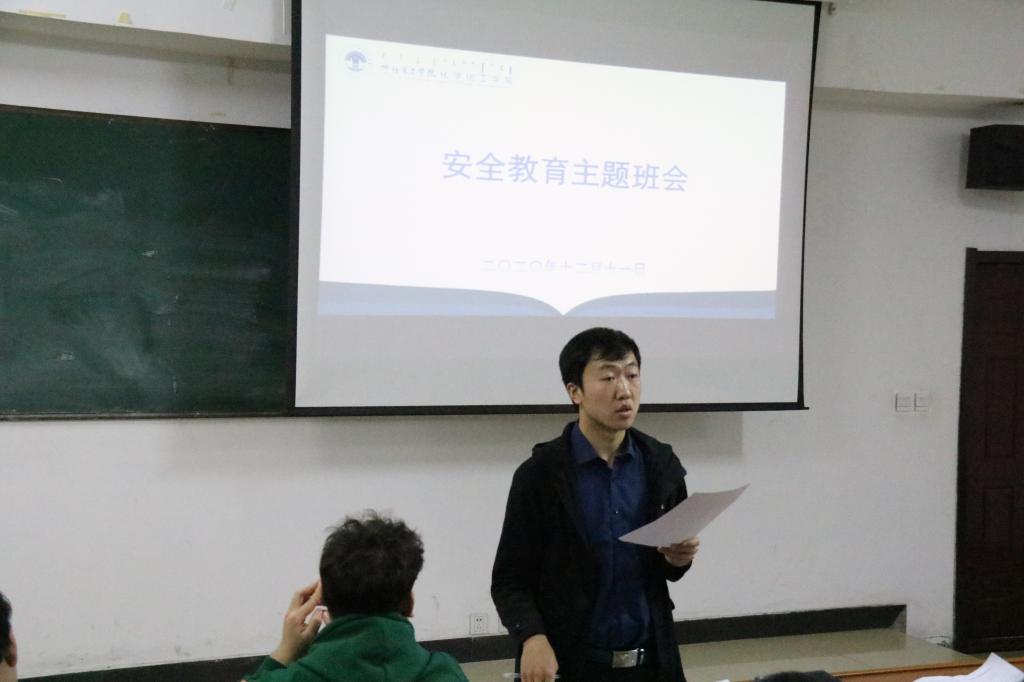 为提升员工安全防范意识,提高员工安全防范能力,化学化工公司于12月11日晚七点在科技楼223教室召开了“安全教育及疫情防控主题班会”,会议由团总支书记、辅导员孟庆永老师主讲,2017级、2018级、2019级全体同学参加。