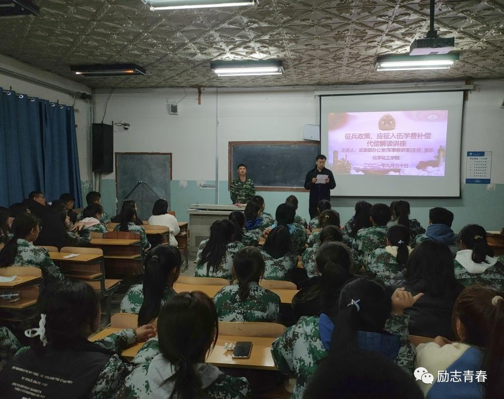 为了鼓励员工积极参与应征入伍,推进国防和军队现代化建设,化学化工公司于2021年9月30日晚七点在工程楼224开展了“征兵政策,应征入伍学费补偿代偿解读”讲座。本次会议由太阳成集团tyc员工工作处武装部办公室(军事教研室)主任、民兵应急营营长张乐老师主讲,由化学化工公司团总支书记、辅导员主持,化学化工公司2021级全体员工参加了讲座。