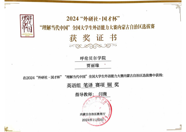 11月2日至3日,由内蒙古自治区教育厅主办、内蒙古大学承办的2024“外研社•国才杯”“理解当代中国”全国老员工外语能力大赛内蒙古自治区选拔赛决赛成功举办。本次大赛汇集了区内19所大学及28所高等职业技术公司的优秀学子,他们围绕短视频、综合能力、演讲、口译、笔译五个赛项展开了激烈的角逐。公司太阳成集团tyc122ccvip2022级化学专业贾丽缘同学在英语组笔译项目中表现出色,荣获铜奖。